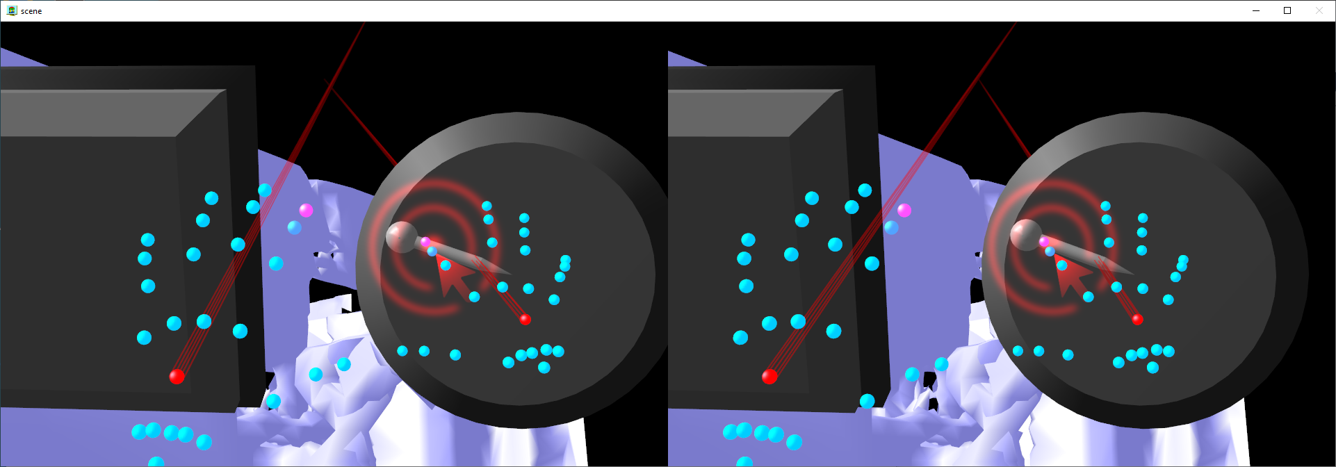 Virtuální přístroj gl_scene má také několik vlastností, které nám zjednodušují přesné usazení vykreslované scény do reálného prostoru. OCL procedurou PositionScene( Tracking : boolean ) lze zapnout a vypnout mód, kdy je scéna trvale vykreslována z počáteční pozice kamery nezávisle na aktuální pozici headsetu. Ve zvolené pozici headsetu pak jednoduše tracking vypneme a pozice scény se v prostoru zafixuje. Vypnout tracking je možno i gestem dvojkliku ruky viditelné kamerami headsetu. K upravení pozice prostoru scény lze použít i metodu SetSceneLocation( ScenePositionX, ScenePositionY, ScenePositionZ, SceneRotationX, SceneRotationY, SceneRotationZ : real ). Zde jsou rotace pro pohodlnější práci prováděny kolem posunutého počátku souřadného systému, nikoliv podle původního.