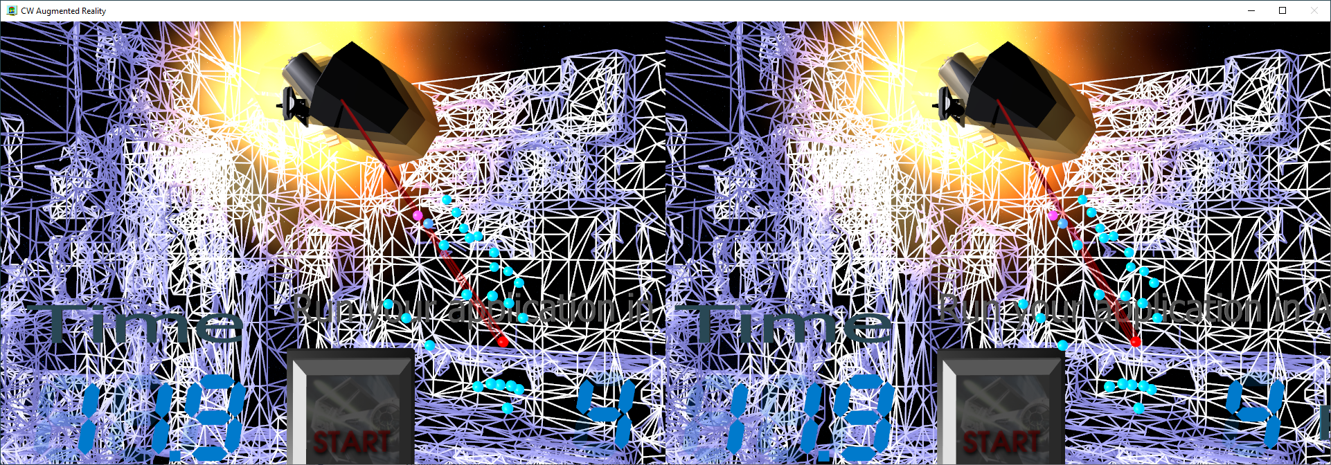 Tvorba aplikace pro rozšířenou realitu je již o poznání složitější. Scéna musí být vykreslována se shodným zorným úhlem, v jakém daný headset generuje obraz. V případě Hololens 2 je to 34 stupňů vertikálně při poměru šířky a výšky obrazu 3 : 2. Jen při dodržení těchto parametrů lze generované hologramy přesně usadit do reálného prostředí. Do skutečného prostoru musí být také velmi přesně umístěny tzv. hloubkové mapy, které nám zajišťují překrývání generovaných hologramů reálnými objekty v našem okolí. Pozici a měřítko hloubkových map v prostoru scény lze nastavit OCL procedurou SetDepthmapLocation( PositionX, PositionY, PositionZ, ScaleX, ScaleY, ScaleZ : real ). Parametry je možno zjistit interaktivně, uložit je do souboru a poté je vždy automaticky při startu aplikace pomocí této procedury do scény vložit. Přesnost a kvalitu polygonálních hloubkových map pak již příliš ovlivnit nedokážeme. Tvorba hloubkových map z obrazů dvou kamer headsetu rozhodně není triviální úlohou. Hloubkové mapy si můžeme nechat vykreslovat, např. za účelem jejich pozicování, pomocí plných trojúhelníkových síti nebo jako drátěné modely. Způsob vykreslování hloubkových map můžeme nastavovat procedurou scény DepthmapRenderingMode( Mode : integer ). Druhou podstatnou věcí je umístění generovaných 3D objektů do reálného prostoru. Po spuštění aplikace nám systém trvale vykresluje scénu v iniciální pozici kamery bez ohledu na aktuální pozici headsetu. Po přesném usazení objektů lze do normálního vykreslování přejít "dvojklikem" pomocí ukazováčku a palce ruky. Díky snímání pozic a gest rukou jsou zde možnosti ovládání aplikací oproti virtuální realitě bohatší. Máme zde rovněž k dispozici paprsek vycházející z ruky, kdy klik levým tlačítkem myši vytvoříme gestem ukazováčku a palce ruky, a navíc můžeme 3D virtuální přístroje přímo koncem ukazováčku v prostoru ovládat. V tomto prostředí nelze volně létat, k ovládacím prvkům musíme vždy přijít tak, abychom na ně rukou dosáhli.
