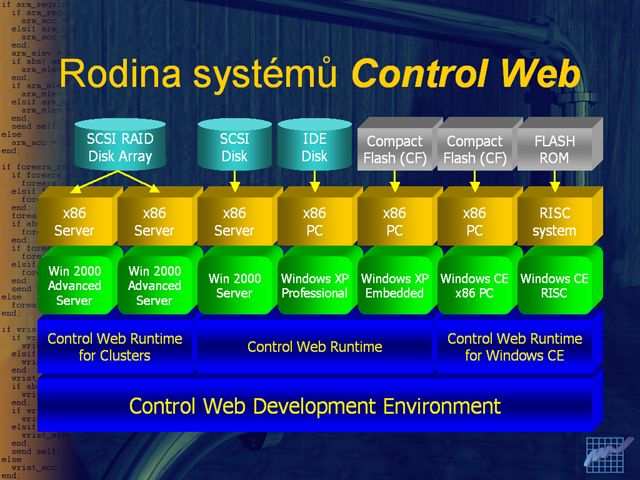 It is difficult to define „what it is“ Control Web or to name all its features on limited space. Control Web can work as simple and accessible tool for implementation of small hydro control system. It can also work as a tool for creation of large-scale enterprise distributed application capable to communicate over tenths of thousands of input/output points, containing hundreds of operator panels, working on number of distributed computers within a network. Control Web can also act as software bridge among SQL database, WWW browsers and GSM mobile phone network. Control Web is a fun tool saving a lot of work in school laboratories, performing automatic measurement and creating protocols for many students.
