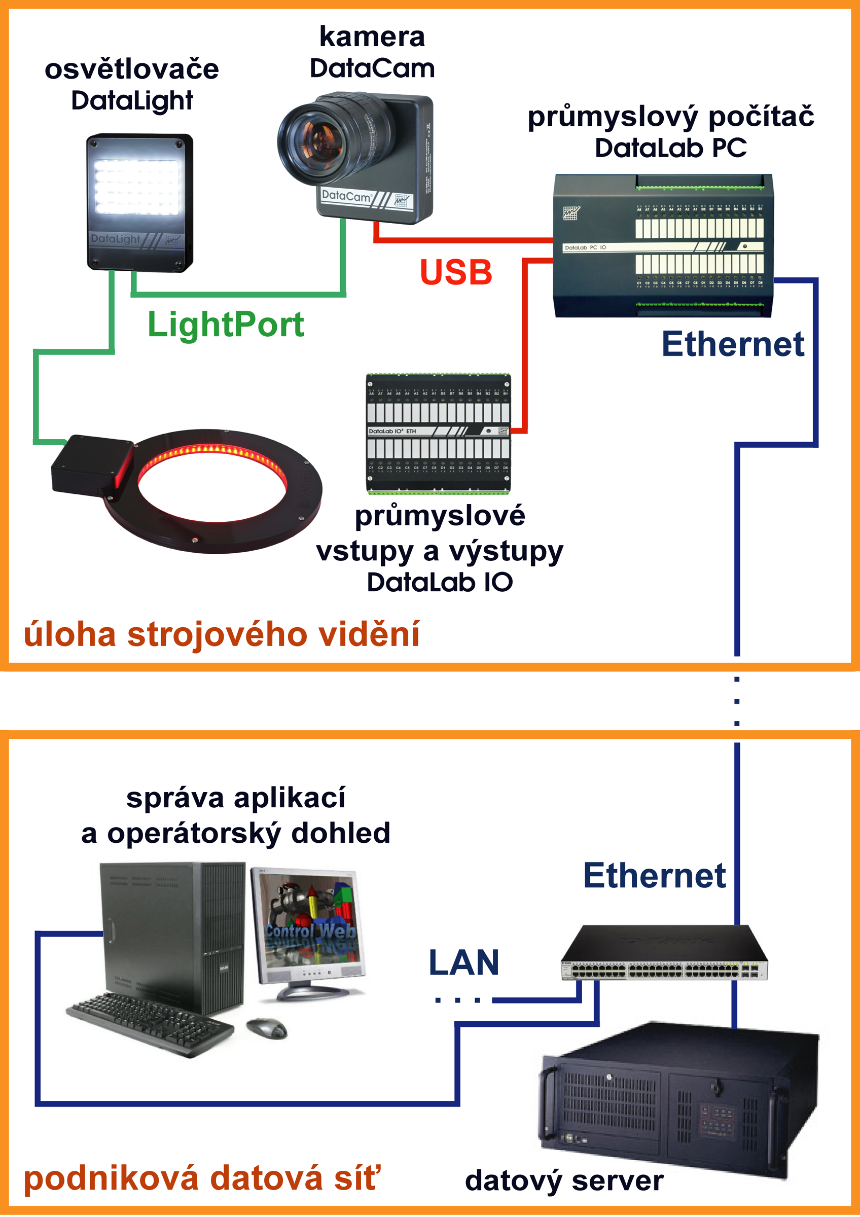 Značné možnosti propojení rozličných systémů a jejich vzájemnou spolupráci umožňuje ta skutečnost, že systém strojového vidění VisionLab je součástí neobyčejně rozsáhlého programového prostředí Control Web. Jediný řídicí počítač, ke kterému jsou připojeny kamery a který řeší úlohu strojového vidění, může sloužit jako řídicí a komunikační jednotka celého automatizačního systému a současně jako rozhraní mezi člověkem a strojem. K tomuto počítači lze dále podle potřeby připojit patřičný počet vstupně-výstupních jednotek DataLab. Tyto jednotky mohou být připojeny prostřednictvím: ° USB – na krátkou vzdálenost v rámci jednoho stroje při požadavku vysoce rychlých odezev v reálném čase ° Ethernetu – na libovolně velkou vzdálenost s možností využití síťové infrastruktury závodu ° RS 485 – na velkou vzdálenost při použití úsporné a levné kabeláže