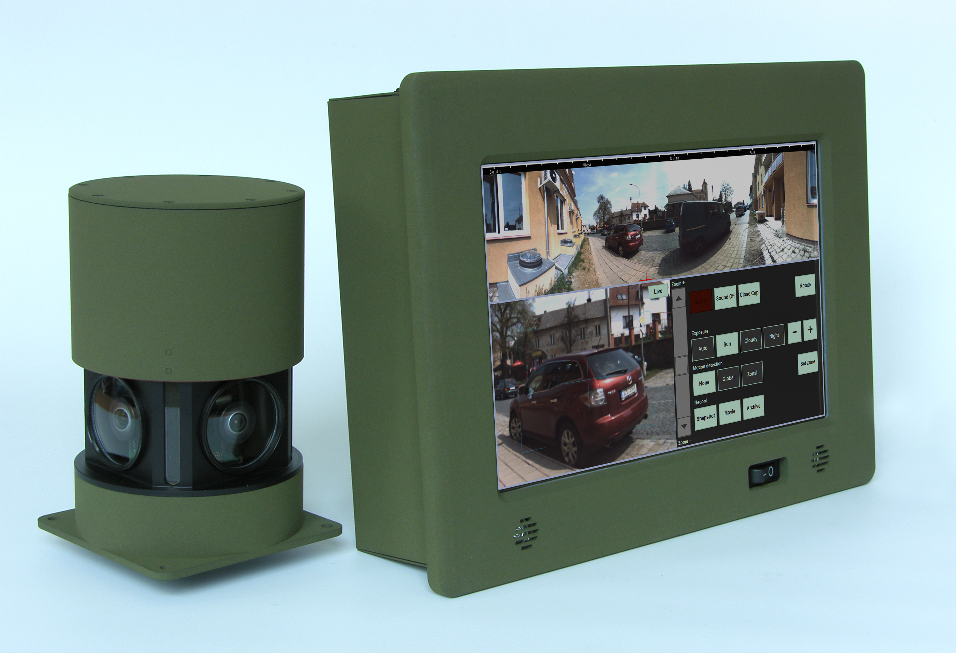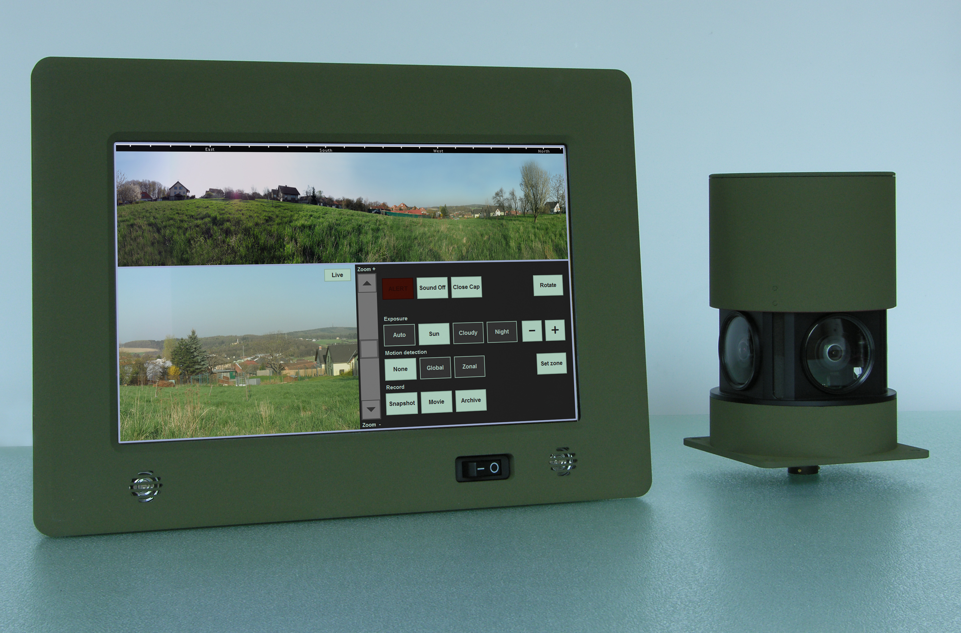 1. Komplet panoramatické kamery a vestavné zobrazovací jednotky. Kamera je k zobrazovací jednotce připojena jedním kabelem pomocí odolného konektoru Amphenol. Zobrazovací jednotka je vybavena odolným kapacitním dotykovým panelem velikosti 12" s rozlišením 1280 x 800 obrazových bodů. Systém může být napájen z palubní sítě motorového vozidla.