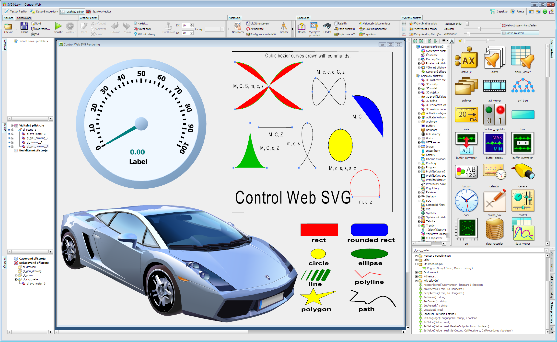 Kombinace základních 2D přístrojů, 3D přístrojů a SVG grafiky v jedné scéně