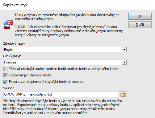 Jazykový editor také umožňuje zkopírovat texty z jednoho
