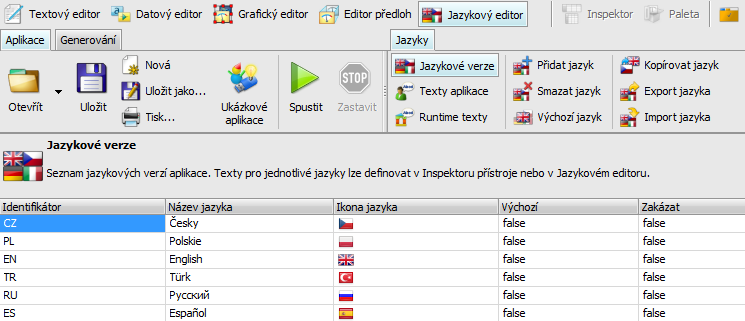 nadefinovaných jazyků používaných v aplikaci. Jazyky je zde