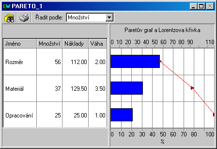 V pravé části jsou tyto hodnoty vyneseny do sloupcového grafu, ve kterém každý sloupec charkterizuje jeden druh vady a jeho výška odpovídá její četnosti. Sloupcový graf je doplněn Lorentzovou křivkou kumulovaných četností v procentním vyjádření.