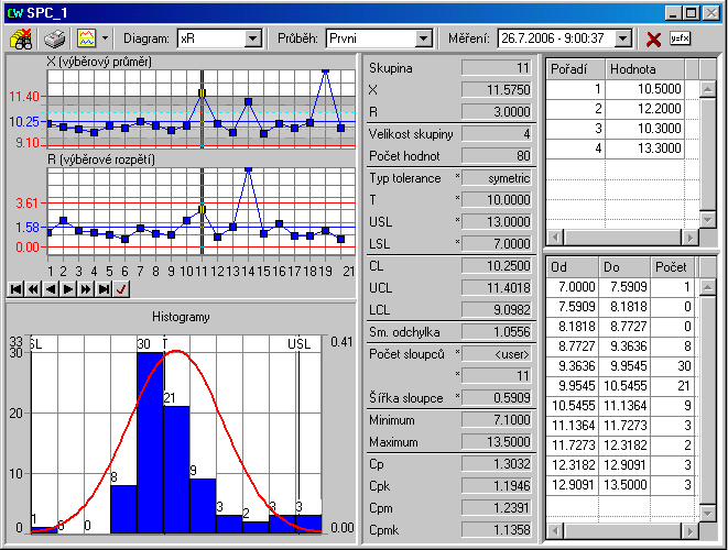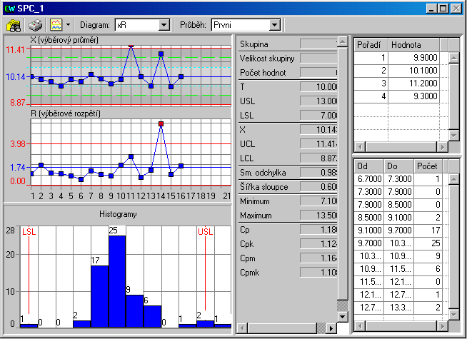 Přístroj SPC umožňuje pro sledování výrobního procesu volit a zobrazovat dvojice grafů xR, Median_xR, a xs pro skupiny s počtem vzorků větším než jedna a dvojici Single_xR pro velikost skupiny s jedním vzorkem.