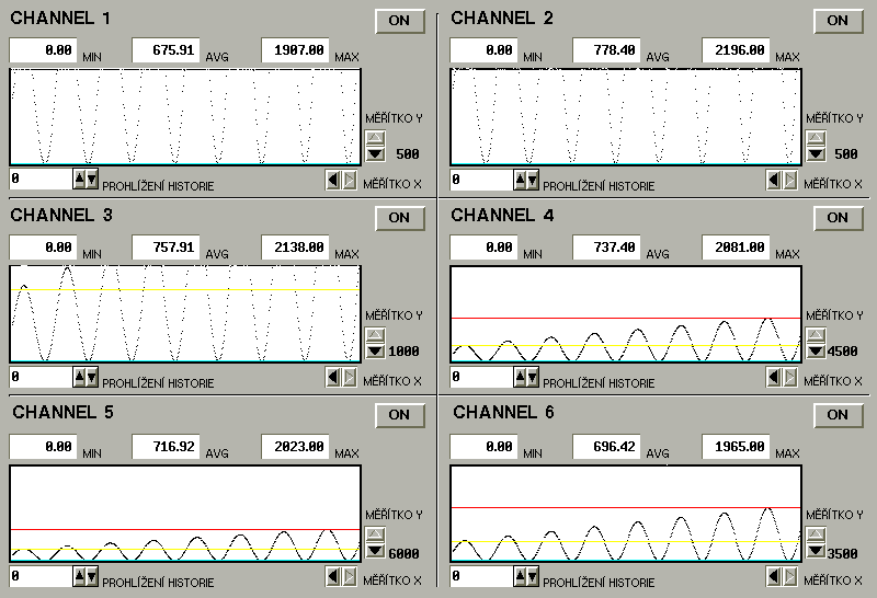 Hodnoty jsou získávány prostřednictvím karty PCL 818HG a jsou