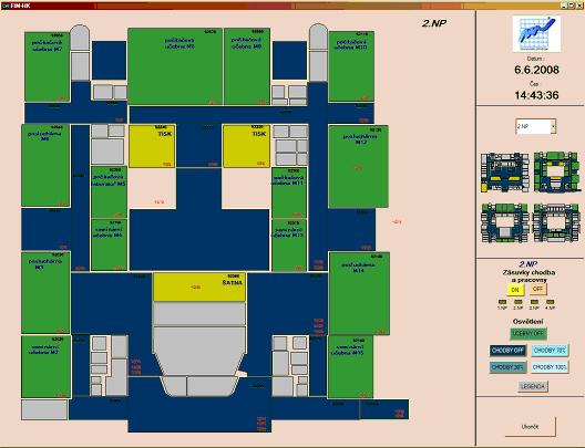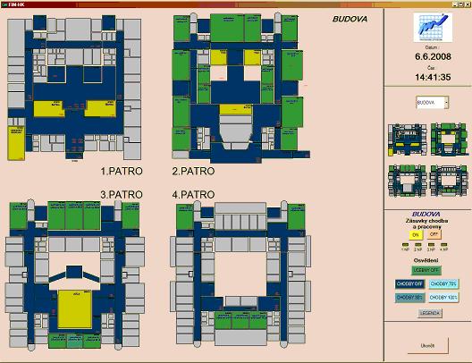- vizualizace stavu osvětlení, zásuvek a žaluzií včech prostor budovy