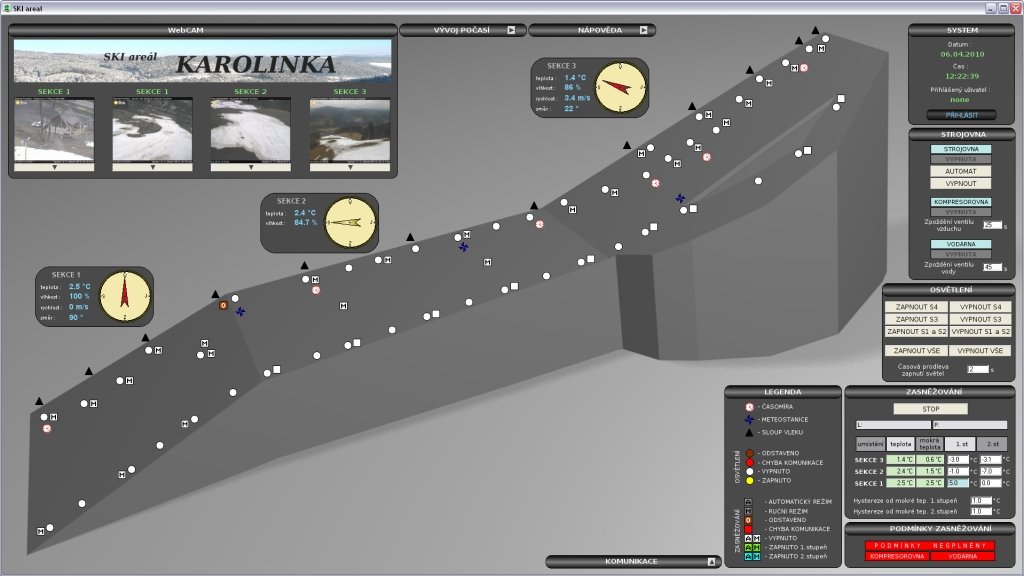 • Program slouží pro monitorování naměřených údajů pomocí web kamer, které jsou umístěné podél sjezdovky ve třech sekcích (dole, uprostřed a nahoře). V těchto třech bodech se měří teplota a vlhkost. V horní a dolní části sjezdovky se dále měří směr a rychlost větru. Mokrá teplota se dopočítává z naměřených údajů. Naměřené hodnoty jsou v aplikaci zobrazeny pro jednotlivé sekce a dále jsou archivovány a zaneseny do grafů. Program dále umožnuje ovládání osvětlení a zasněžovaní podél sjezdovky. V aplikaci jsou zobrazeny i akuální snímky z web kamer na sjezdovce.