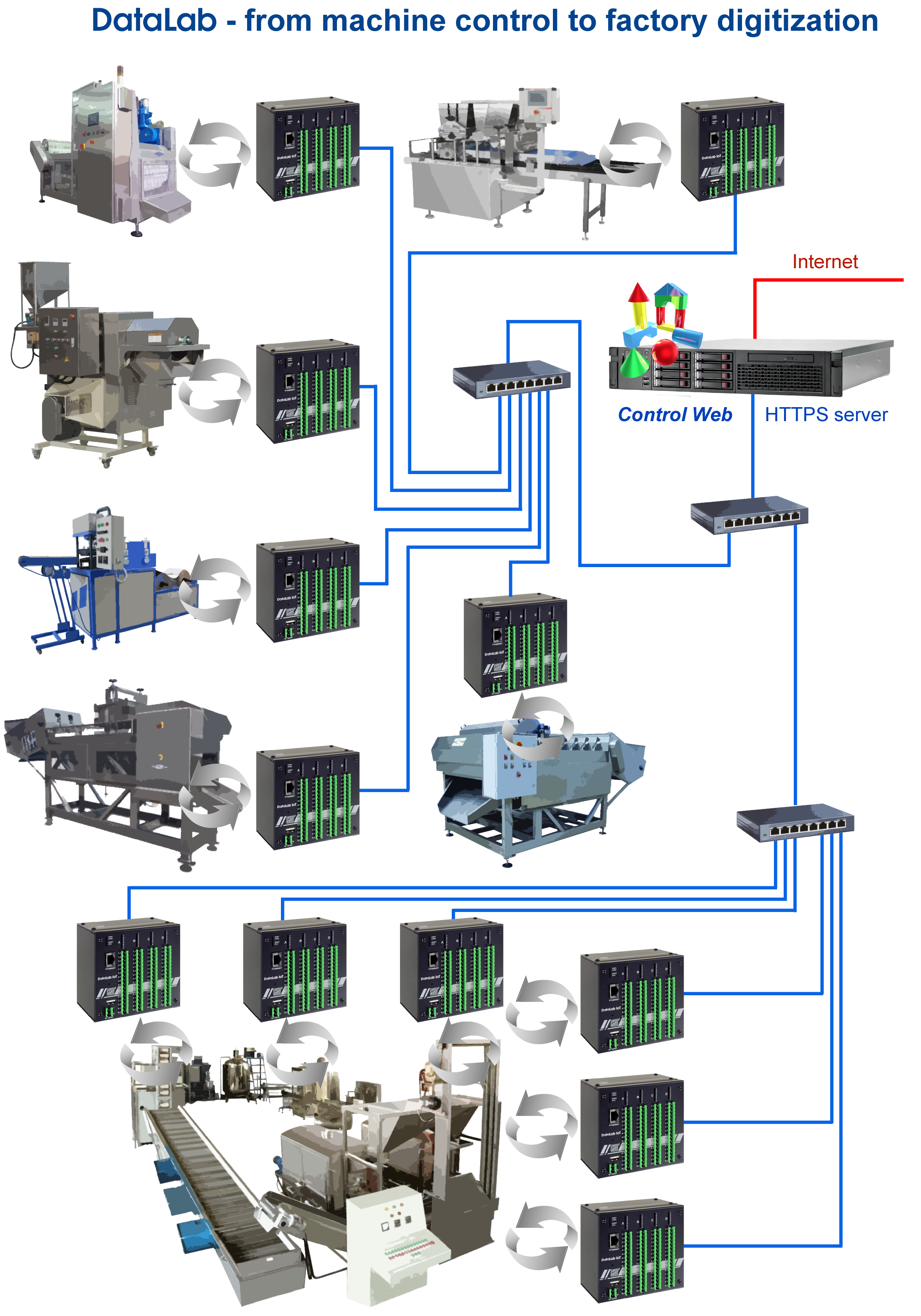 Bezpečná struktura digitalizace výrobního provozu s jednotkami DataLab připojenými k oddělené TCP/IP síti.