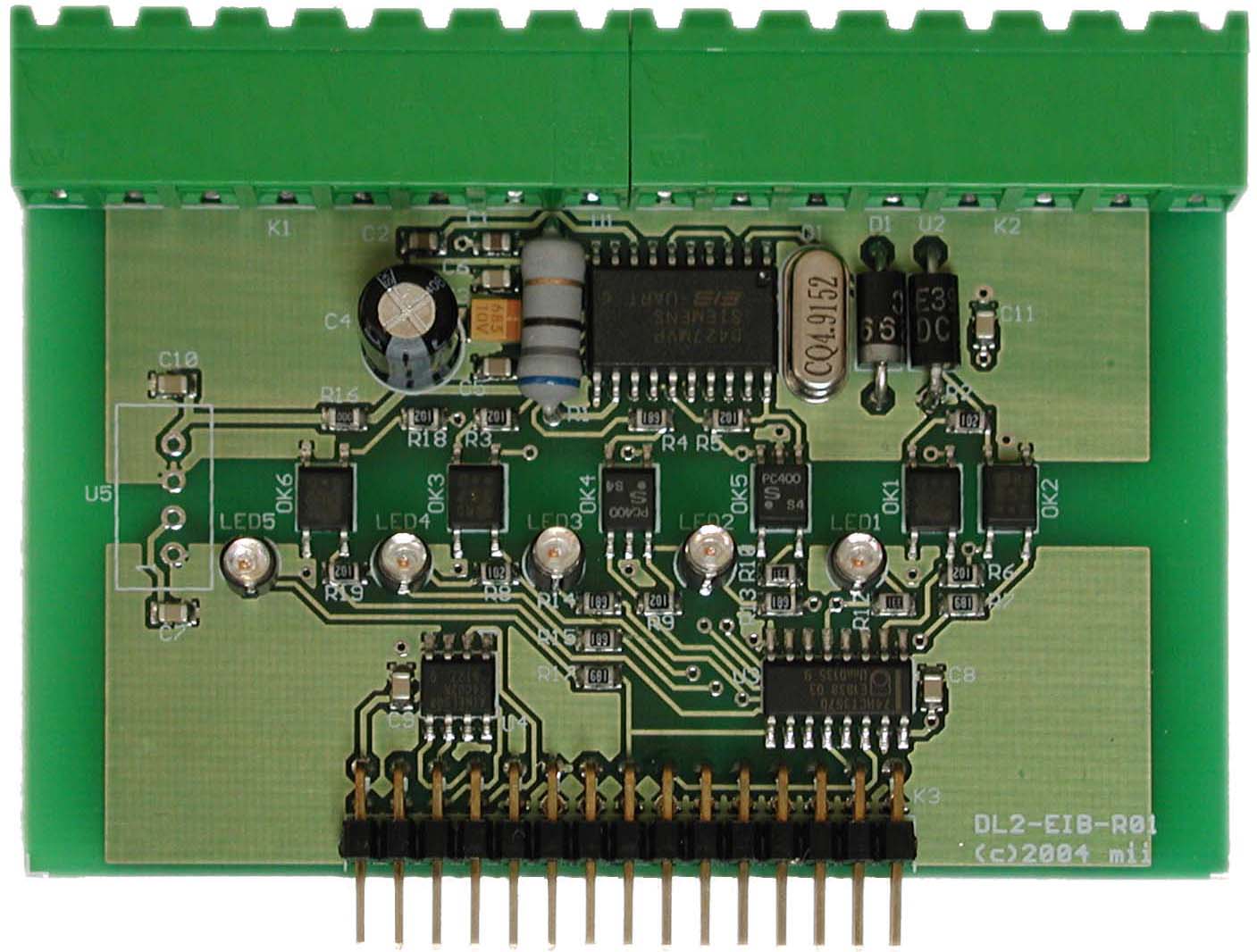 The DL-IF/EIB module contains a galvanically separated interface for the EIB busbar resolved by means of ASIC Siemens TP-UART. The module displays the hardware status by means of LED indicators.