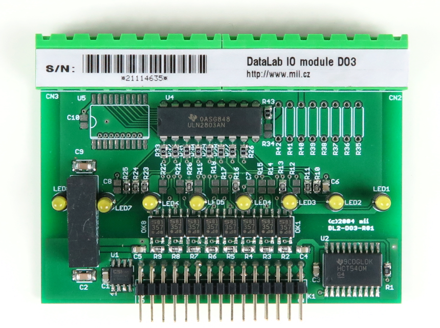 Modul DO3 obsahuje osm digitálních spínacích výstupů s otevřeným kolektorem. Výstupy mají společný pól. Sepnutý výstup je indikován LED.