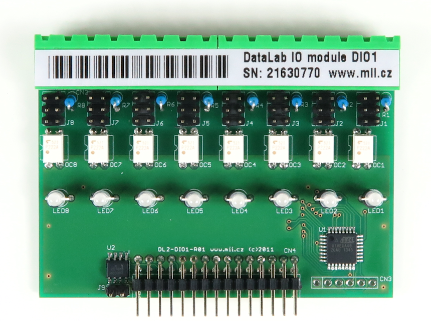 Modul DIO1 obsahuje osm galvanicky oddělených digitálních vstupů/výstupů. Propojky na desce plošných spojů modulu dovolují určit, zda na konektor modulu budou vyvedeny vstupní či výstupní obvody. U vstupních obvodů lze zvolit vstupní odpor a tím i rozsahy vstupních napětí vyhodnocovaných jako logická nula a jedna. Směr i rozsahy každého vstupu je možné volit nezávisle. Přítomnost aktivní úrovně signálu na vstupu je indikována pomocí LED (zelená). Výstupní obvody modulu jsou tvořeny tranzistory MOSFET. Tyto výstupy se vyznačují malým vnitřním odporem v sepnutém stavu a tím pádem nízkým ztrátovým výkonem na spínacím prvku. Velkou výhodou je možnost spínat napětí obou polarit. Výstupy jsou navzájem galvanicky odděleny. Sepnutý výstup je indikován LED (žlutá).